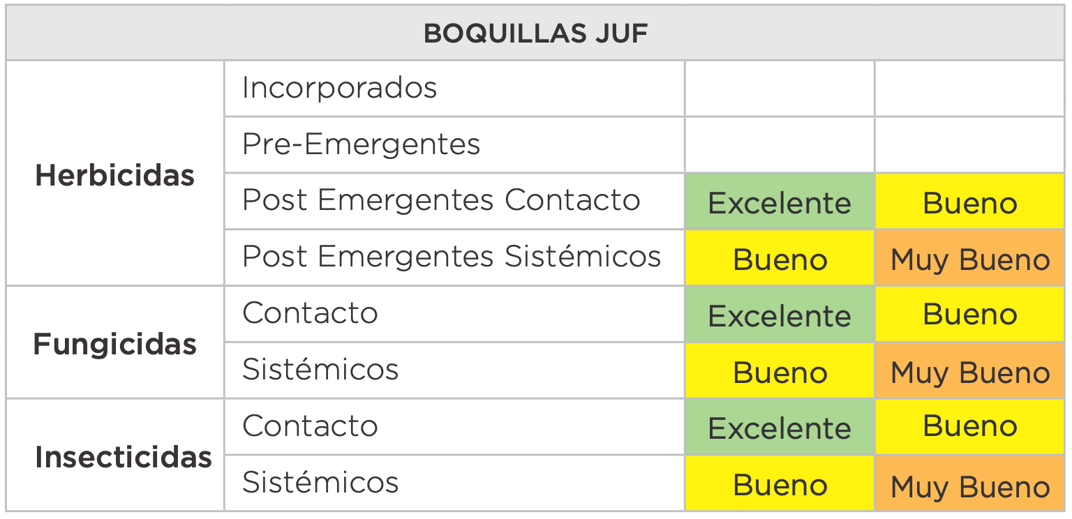 La boquilla Jacto JUF es ideal para aplicaciones de fungicidas e insecticidas de contacto, particularmente en tratamientos donde se busca máxima cobertura foliar y eficacia en el control de plagas y enfermedades. Su desempeño destaca en presiones superiores a 45 psi, ofreciendo un patrón óptimo para productos que requieren contacto directo con el objetivo. A su vez, en presiones menores a 45 psi, se generan gotas más grandes, reduciendo el riesgo de deriva y mejorando la seguridad en condiciones ambientales variables.